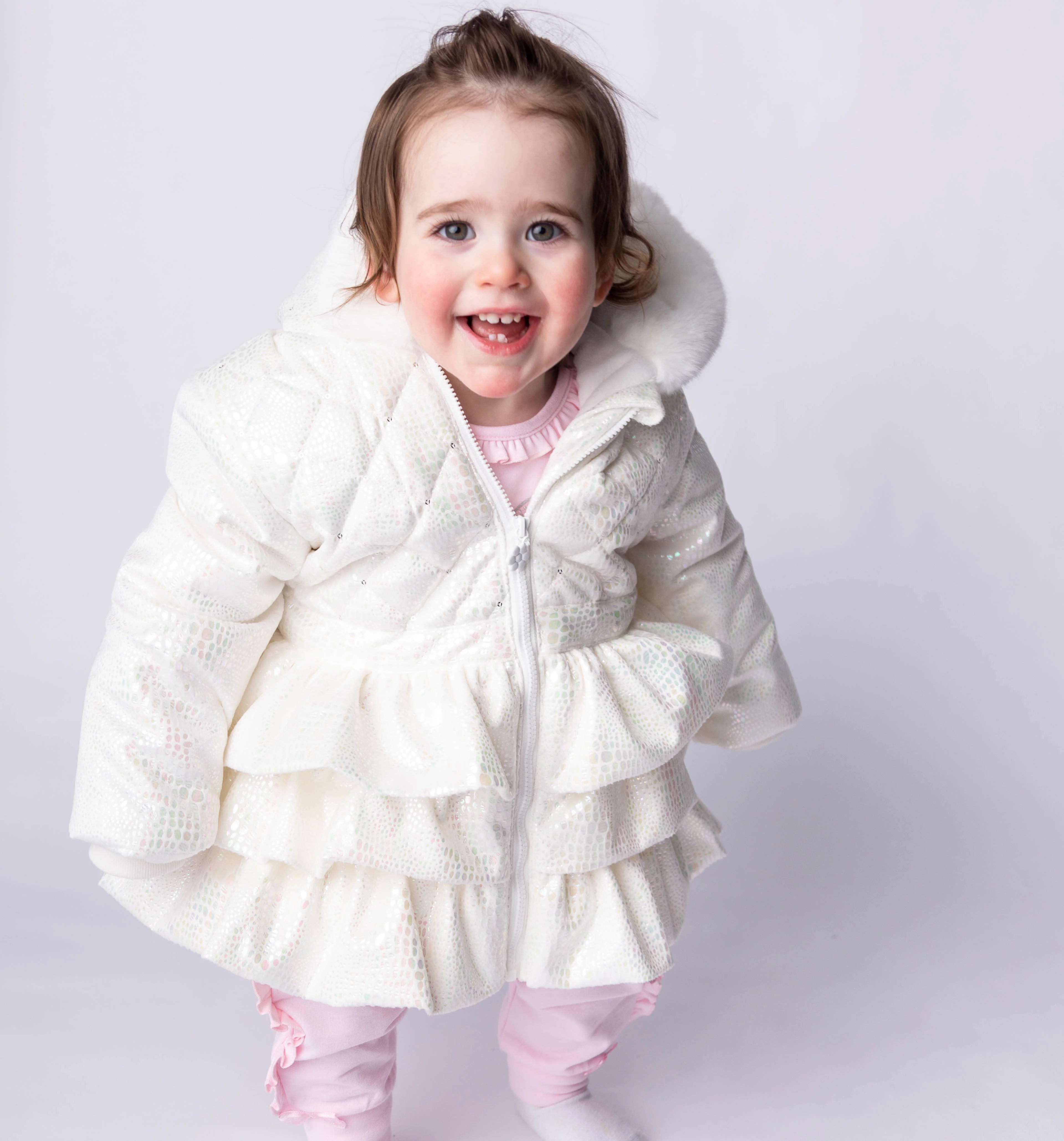 Introducing the White Irridescent Quilted Coat, a charming addition to our outerwear collection. Crafted with utmost care, this wadded coat envelops your little one in warmth and style. The luxurious faux fur hood adds a touch of elegance. Made from 100% Polyester, it promises durability and comfort, ensuring your baby stays cosy on chilly days. Whether strolling in the park or attending a special event, this coat is both practical and adorable.