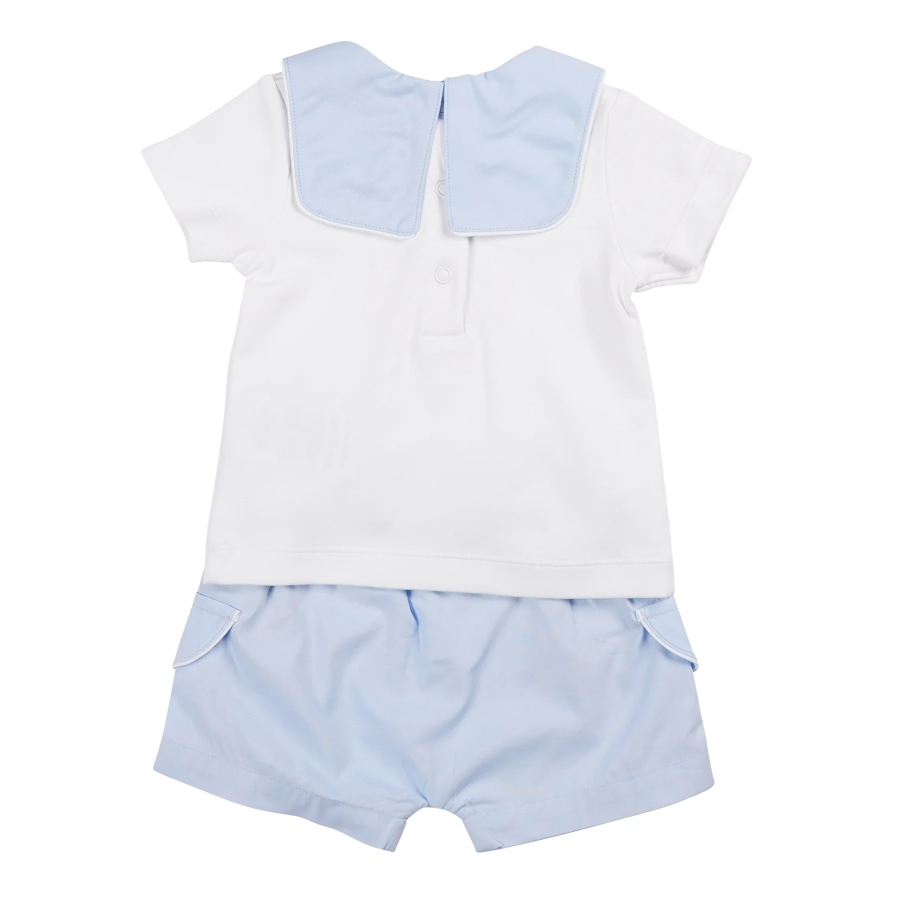 The Blue Boat Top & Bloomer Short is a delightful, 100% cotton outfit designed for comfort and style. The white t-shirt showcases three charming boat images and a playful blue bib-style detail around the collar. It pairs perfectly with baby blue bloomer shorts, featuring practical side pockets and white seam detailing. Lightweight and breathable, this outfit is ideal for warm weather, offering a relaxed yet polished look for little ones on all their summer adventures.