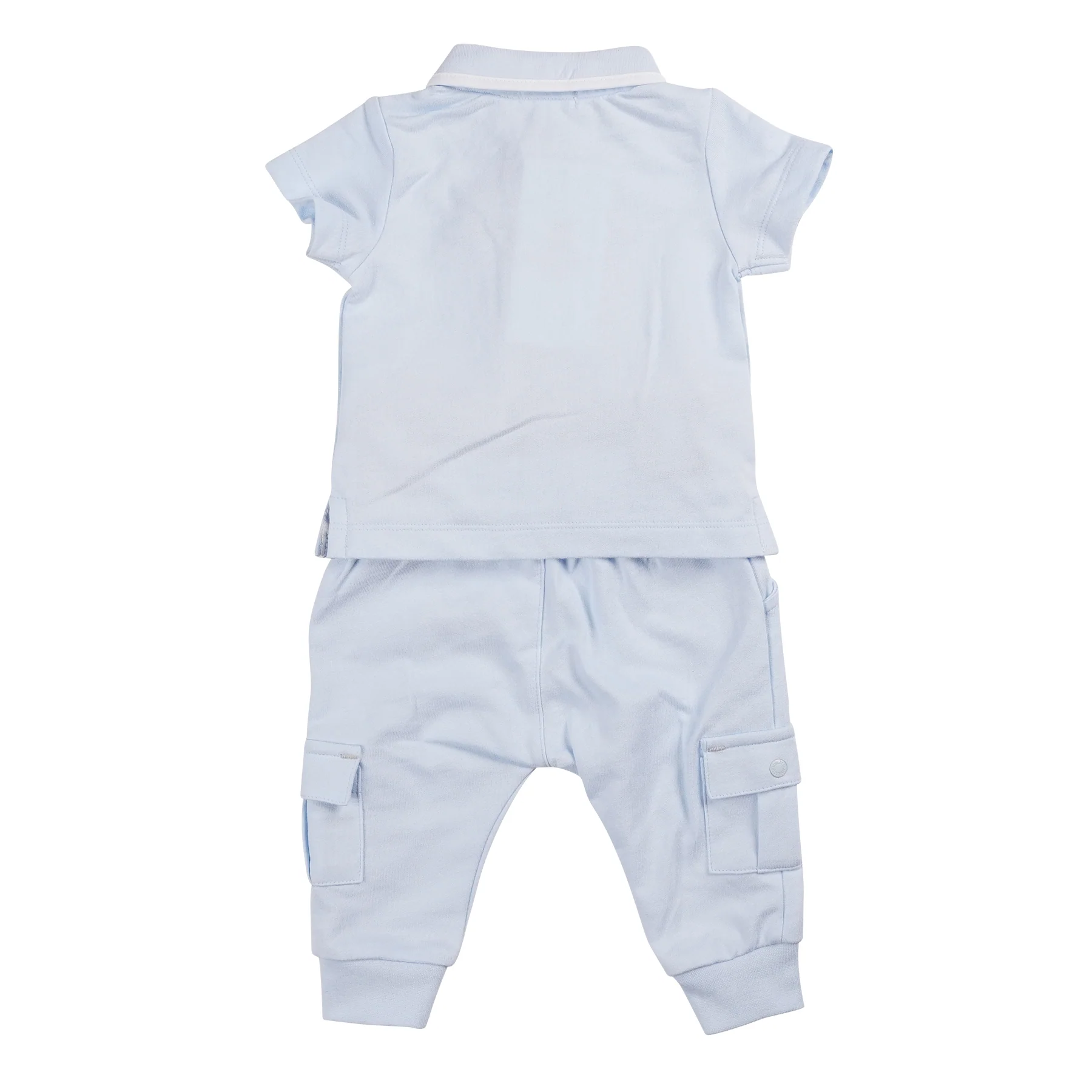 The Blue Tape Polo Top & Jog Pant set combines comfort and style for your little one. The baby blue polo features grey detailing around the collar and classic Mintini tape around the chest, adding a modern touch. Paired with matching blue joggers, which include side pockets for practicality, this set is crafted from 100% cotton for a soft, breathable feel. Ideal for casual days or playtime, this outfit offers both a smart look and everyday comfort for your baby.