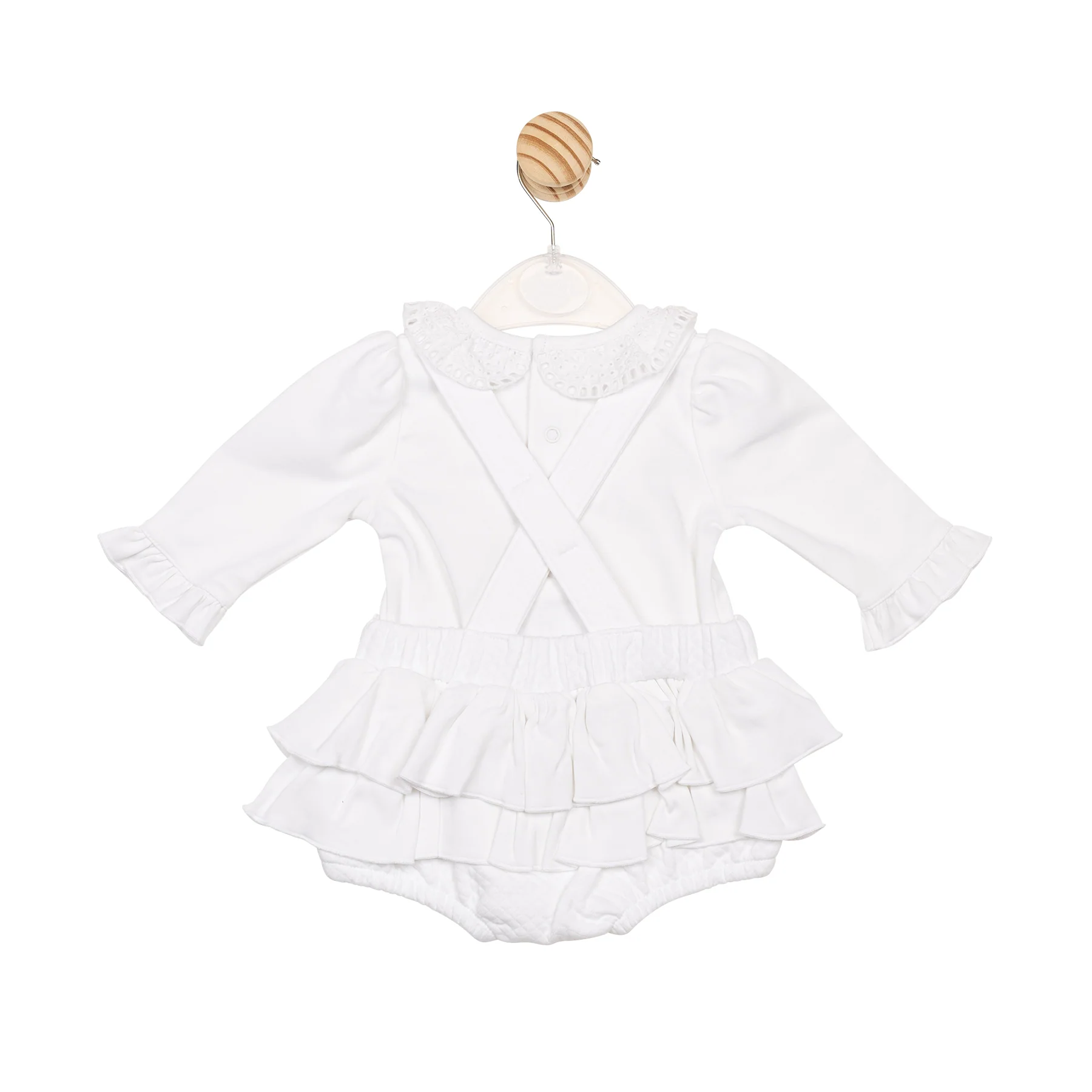 Dress your little one in timeless charm with our White Jacquard Top and Bloomer Dungaree set from the AW25 collection. Designed for baby girls, this elegant two-piece features a long-sleeve white top with a frilly hem and delicate collar, paired with a matching jacquard bloomer dungaree. The dungaree includes crossed straps at the back and double frill layers around the bottom for a playful, feminine touch. Perfect for special moments, this set blends softness, style, and seasonal elegance.