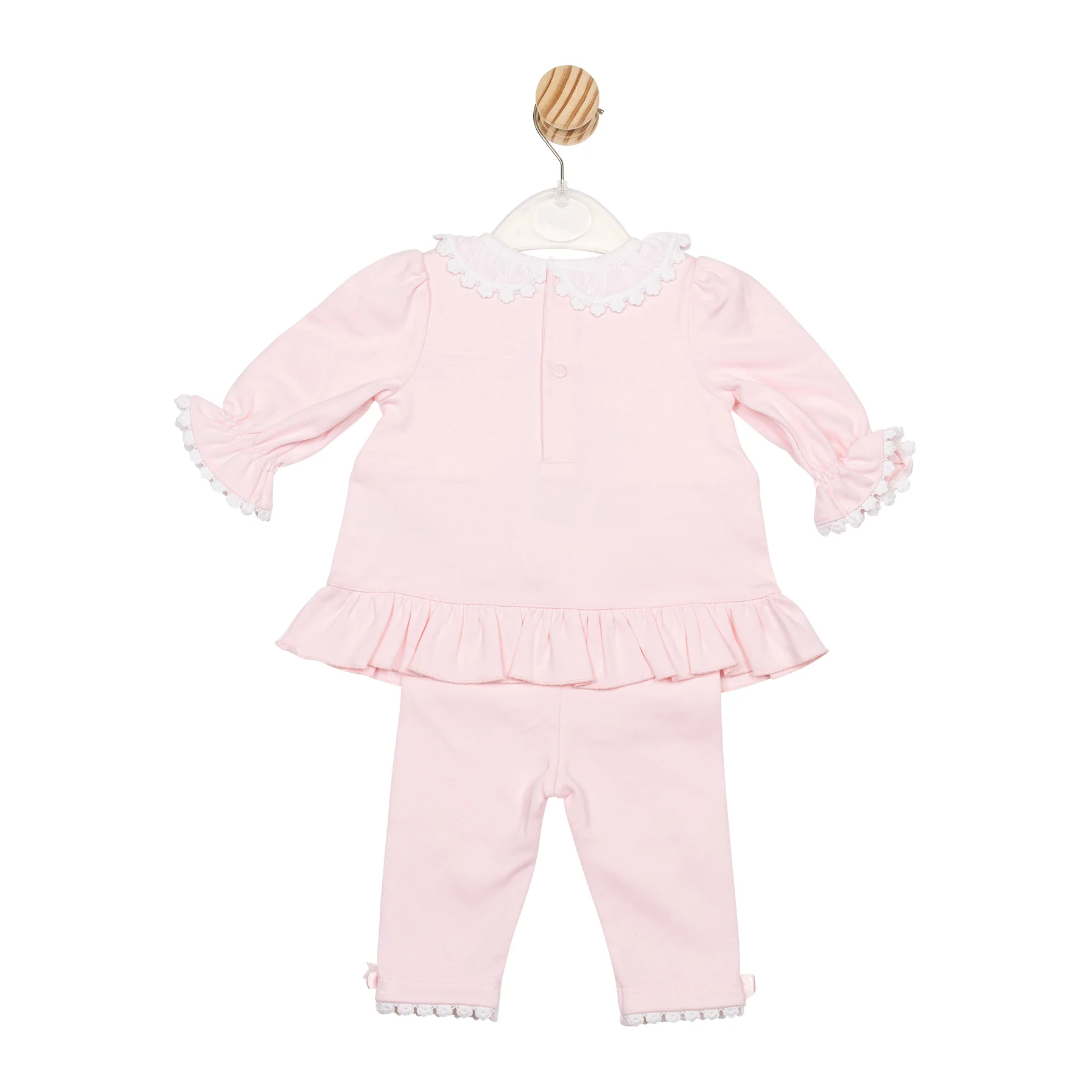 Our Pink Smocked Tunic and Legging Set is a sweet and comfortable outfit for babies and toddlers. Made from 100% cotton, the tunic features a smocked band across the chest, a white ruffle collar, scalloped hem, and balloon sleeves finished with delicate white edging. The bottom of the tunic is gently ruffled for a charming finish. Paired with matching pink leggings featuring coordinating white scalloped hems, this outfit blends comfort with timeless style—perfect for everyday adventures or special outings.